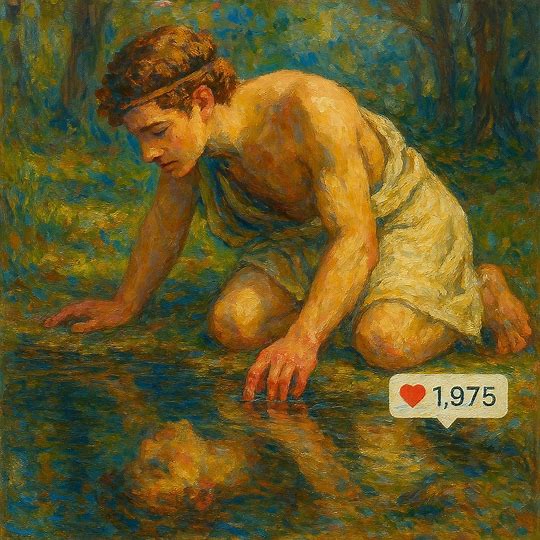 تروي الأساطير الإغريقية القديمة حكاية نارسيس، الشاب شديد الوسامة، الذي جعله جماله يفتتن بانعكاس صورته في الماء. عجز نارسيس عن أن يحول بصره بعيدًا عن صورته فظل يحملق فيها للأبد، وحولته الآلهة إلى زهرة. وبالمثل حينما يلمح المؤثرون انعكاس شخصياتهم الافتراضية المصبوغة بالمثالية على الشاشات، فإنَّهم قد يقعون في خطر الافتتان بها، وبهذا ربما ينسون ذواتهم، وما كان يمكن أن تتطور إليه.