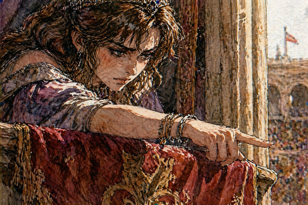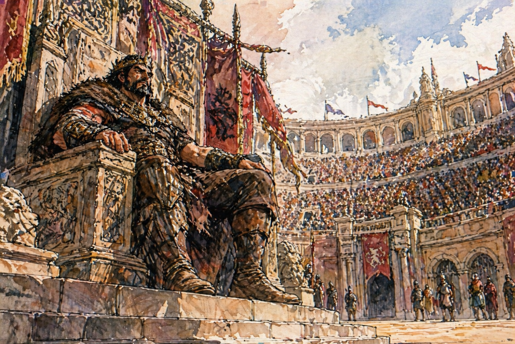 لكن حتى هنا، كان الخيالُ البربريُّ الجامحُ يفرضُ سطوته؛ إذ لم تُشيَّد حلبةُ الملك كي يَسمعَ الناسُ تأوهاتِ المجالدين المحتضرين، أو ليشهدوا تلك الخاتمةَ المحتومةَ لصراعِ العقيدةِ مع أشداق الضواري الجائعة، بل لغاياتٍ أسمى؛ إذ سُخِّر هذا المكان لشحذ وتوسيع مدارك الرعيَّة. فهذا المدرجُ الفسيح، بما يشتمل عليه من أروقةٍ دائريّة، وأقبيةٍ غامضة، ومساربَ عصيَّةٍ عن الأعين، لم يكن إلا أداةً لتجسيد عدالةِ القدر؛ حيث يُعاقَبُ الجُرمُ وتُجزى الفضيلةُ، وفقًا لأحكامِ الصدفةِ النزيهةِ التي تعصى على الفساد.